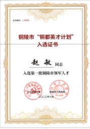 九、赵敏继曾获得“安徽省技术创新领军人才”称号后,2020年又入选铜陵市“铜都英才计划”,被中共铜陵市委、铜陵市人民政府授予首批“铜陵市领军人才”称号。