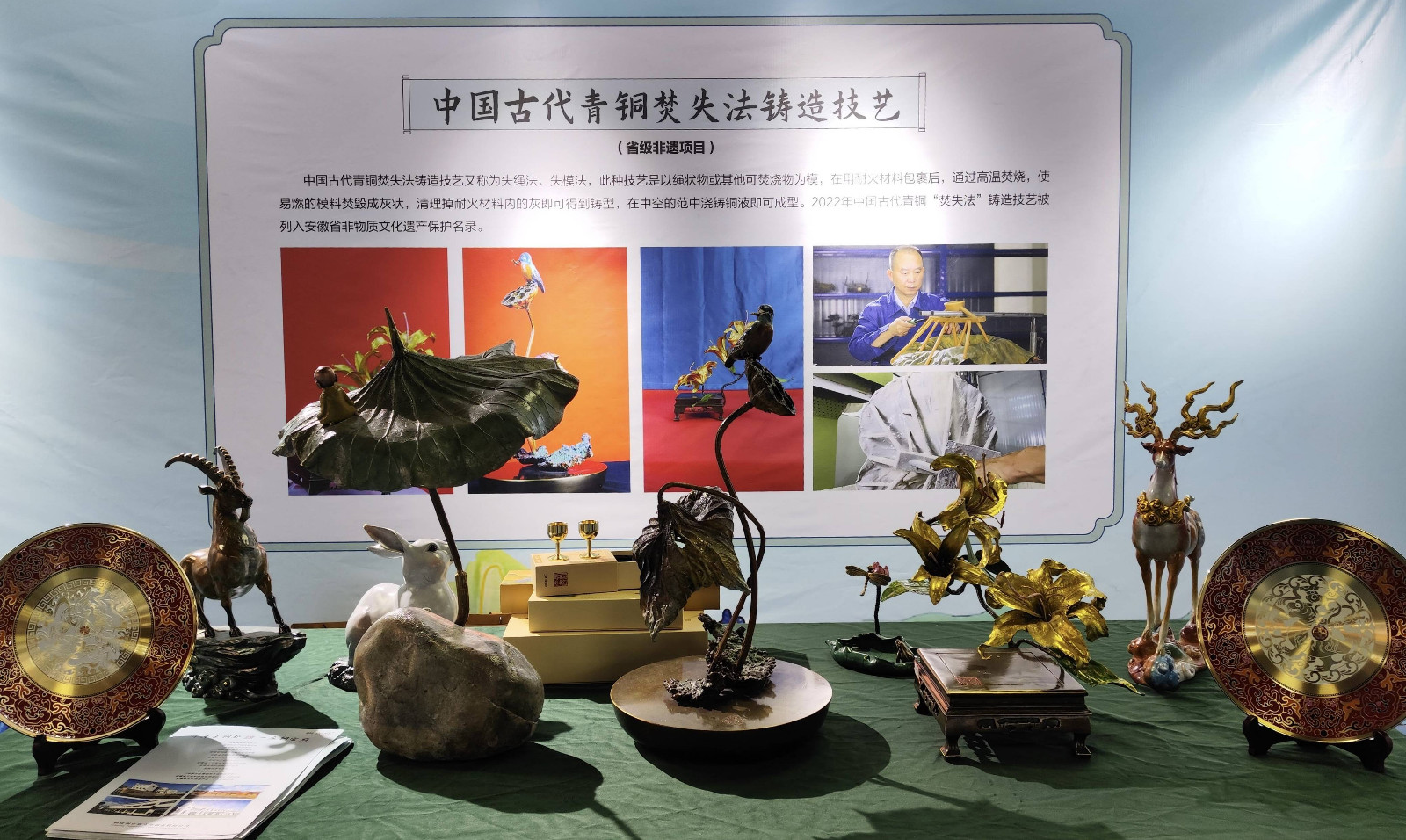 11月22日,以“皖风徽韵·共享瑰宝”为主题的安徽省非物质文化遗产传统技艺大展在蚌埠市举行。我公司的省级非遗项目——中国古代青铜焚失法铸造技艺亮相大展。活动现场,铜陵文化馆馆长、铜陵市非物质文化遗产保护中心主任陈建平向安徽省非遗保护中心主任宋磊、安徽省文化和旅游厅非遗处一级调研员彭正阔一行和现场观众详细介绍了焚失法非遗技艺以及系列作品。焚失法铸造技艺穿越千年,以其独特的工艺和别具一格的艺术风格完成了由实用技艺到艺术创作的转型,展示了非遗传承人的智慧,赢得了大家的一致好评。安徽老字号“铜官府”作为非遗传承的重要力量,将继续坚持守正创新,为传承发展非遗技艺和弘扬传统文化续写新篇章。