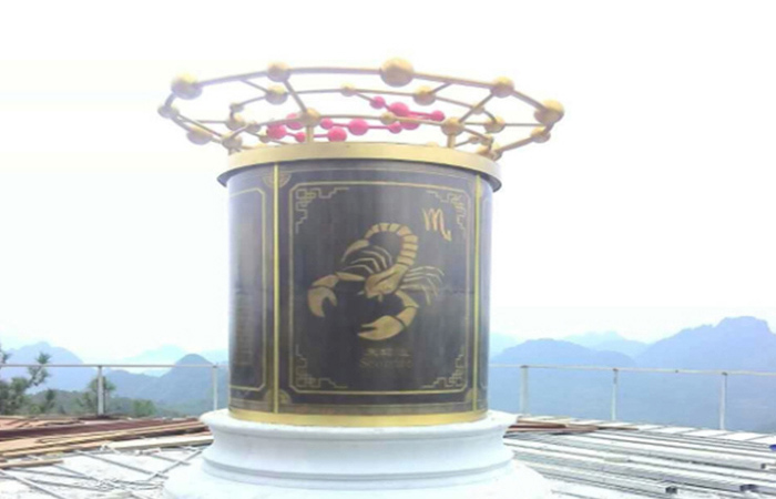 十二星座整体采用直筒造型,简洁大方,大气稳定。采用精铜雕刻工艺精制而成的十二星座铜柱周围的浮雕。